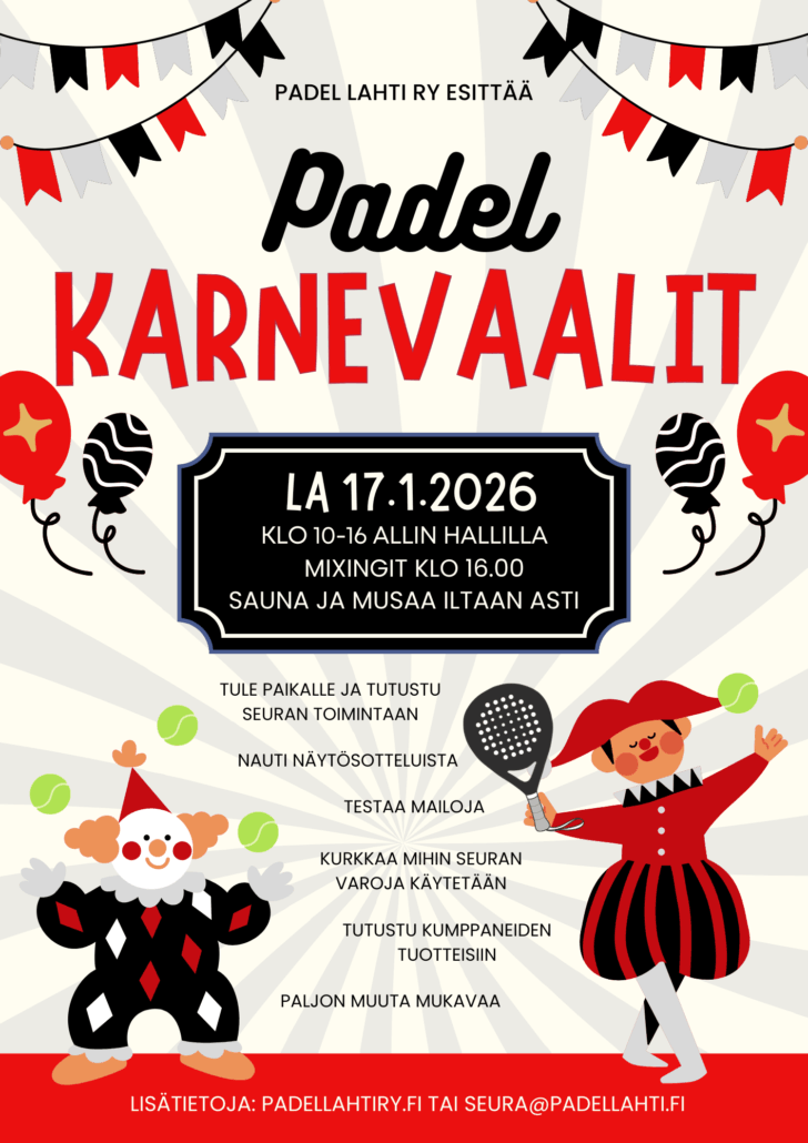 Tervetuloa padelseurojen aktiivit, hallien pyörittäjät tai muuten vain seuran toiminnasta ja lajista kiinnostuneet! Padel Lahti ry järjestää ensimmäiset Padelkarnevaalit lauantaina 17.1.2026!